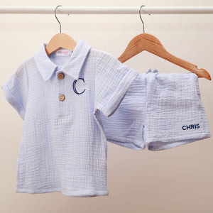 Introducing our Personalised Boys Muslin Shirt and Short Set – a cozy combo crafted from 100% Organic Double Gauzed Muslin Fabric for tiny tots and Little dudes.