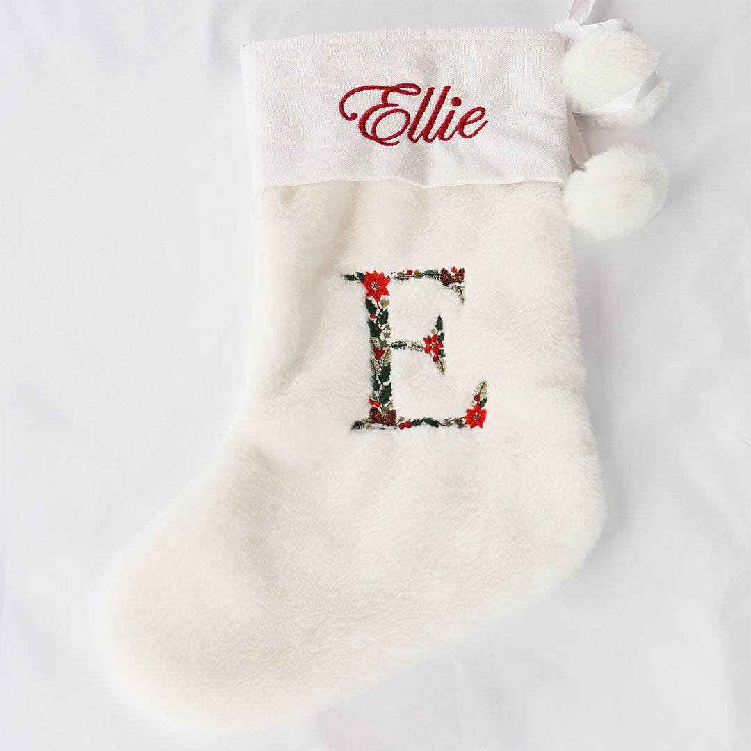 Made with minky - fur like fabric - these stockings feature a pompom ribbon and can be Personalised with a name, initials in Christmas pine monogram, or both!